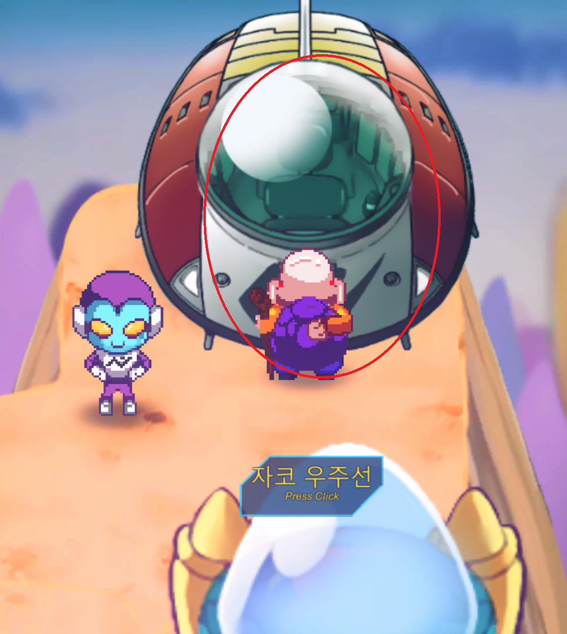 팡이 있는 옆 캡슐 코퍼레이션 안쪽으로 들어가면 1시 방향에 우주선 형태의 캡슐이 있다.